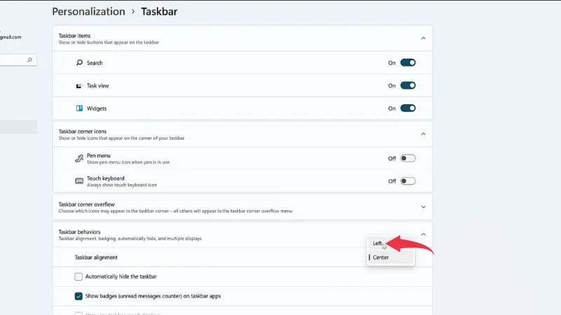 4) Click on the Taskbar Alignment option and you can change the position of your taskbar to either Center or Left. In our case, we are moving it towards the left side of the window screen.
