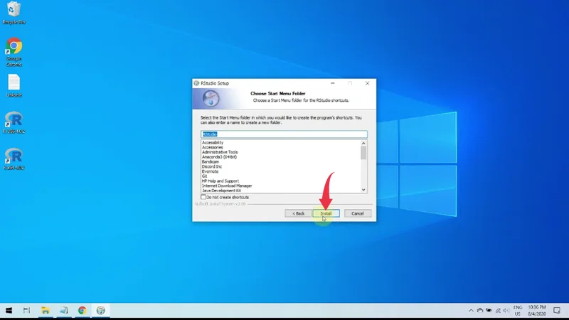 6) In the choose start menu window simply click on the install button and your desired RStudio installation will begin.