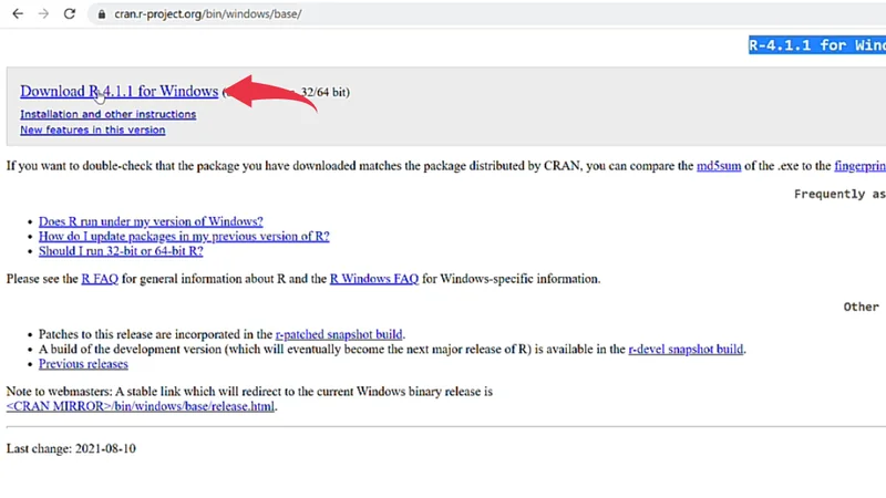 1) Firstly we’ll download and install R. To do so follow the below-provided download link and click on the Download R 4.1.1 for Windows and your download will start.