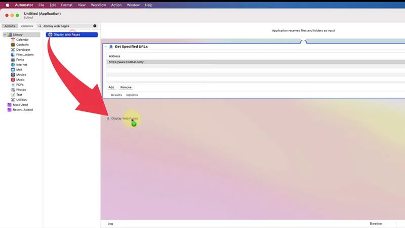 5) Now again in the search bar type “Display web pages” and drag the listed option to workspace as well.