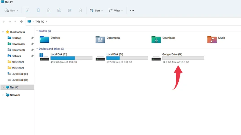 5) After all the above steps open up, This PC [file manager], there will be a new drive with the name Google Drive.