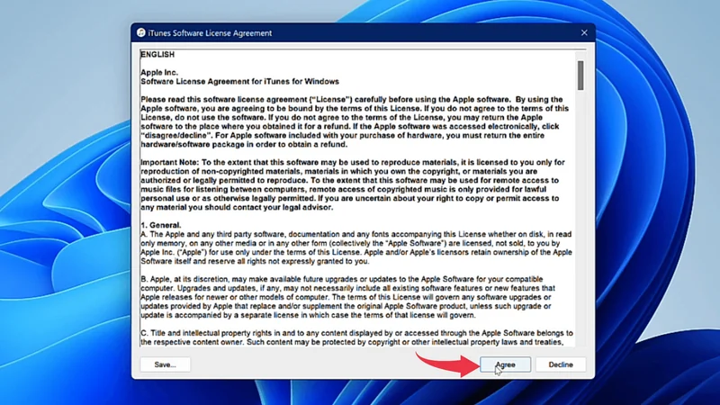 5) For the first time you’ll see a license agreement, click on the Agree button to start using iTunes.