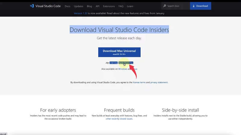 1) Firstly we’ll download the latest available version of Visual Studio Code. Follow the below-provided download link and you’ll be redirected to the official visual studio code downloads page. There click on the “Intel Chip” button if you’re a non-M1 user or click on “Apple Silicon” if you’re an M1 user and your download will start.