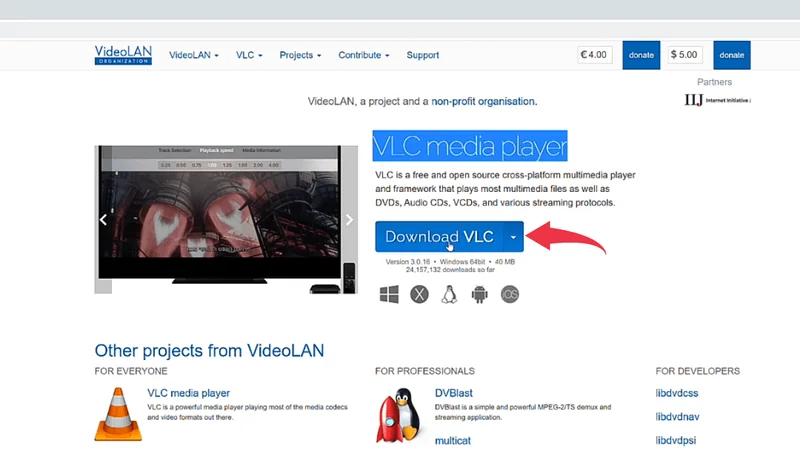 1) Firstly we’ll download the latest available version of the VLC media player. Follow the below-provided download link and you’ll be redirected to the official VLC media player downloads page. There click on the “Download VLC” button and your download will start.