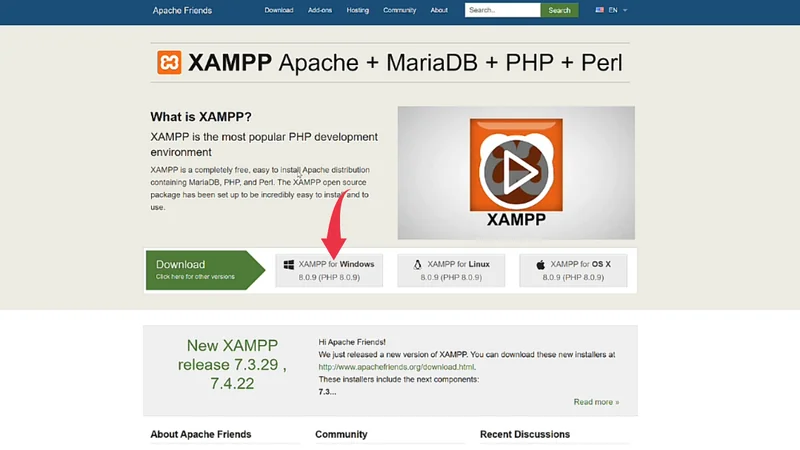 1) Firstly, we’ll download the latest version of XAMPP available on the internet, to do so follow the below-provided download link and you’ll be redirected to the official XAMPP downloads page. There simply click on the Download button next to the version you want to download. In our case, it’s version 7.4.8 / PHP 7.4.8.
