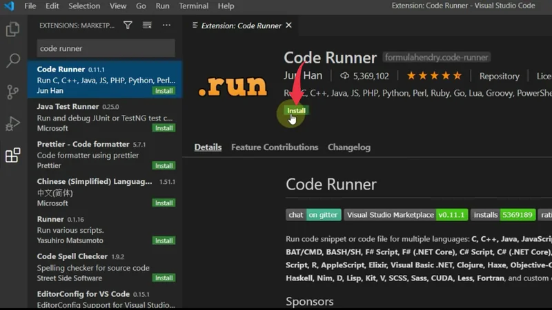 1) Open up visual studio code, press the extensions button and search for “code runner”, select the first option from Jun Han and click on the small green install button.
