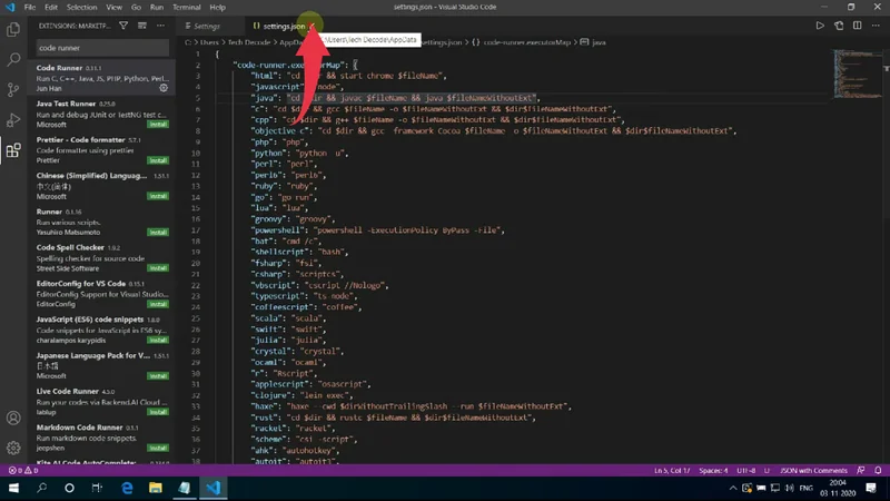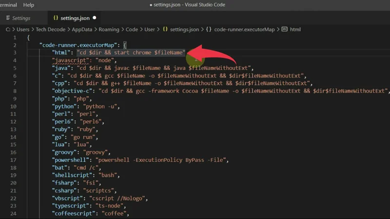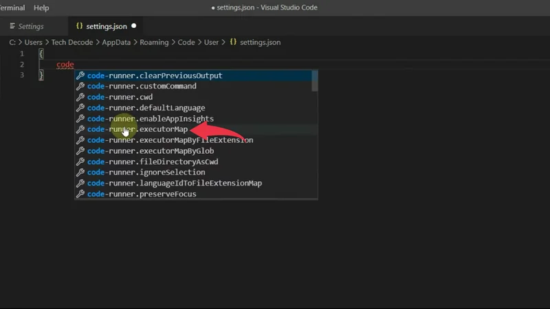 4) In the JSON file type “code-runner.executorMap” within the curly braces and hit enter.