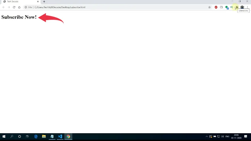 <!DOCTYPE html> <html lang="en"> <head> <meta charset="UTF-8"> <meta name="viewport" content="width-device-width, initial-scale=1.0"> <title> Tech Decode</title> </head> <body> <h1>Subscribe Now!</h1> </body> </html>