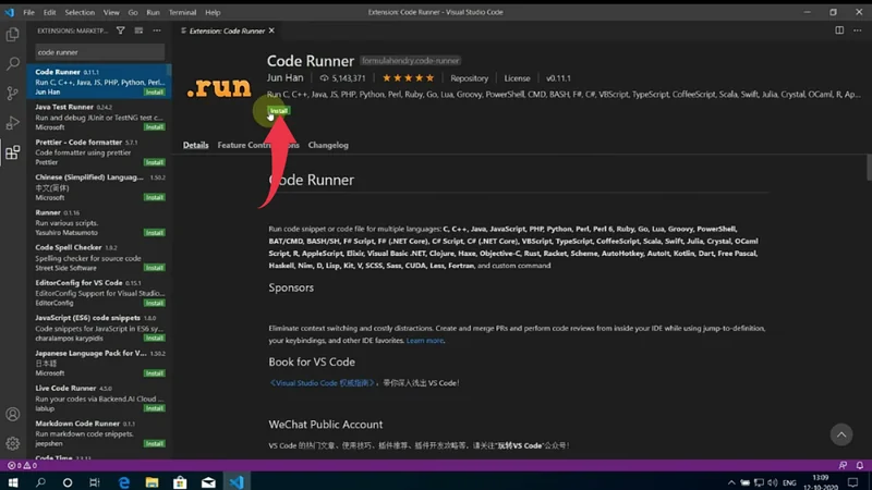 1) Click on the extensions button and in the search bar type “Code Runner” and install the first option provided by Jun Han by clicking on the small green install button.