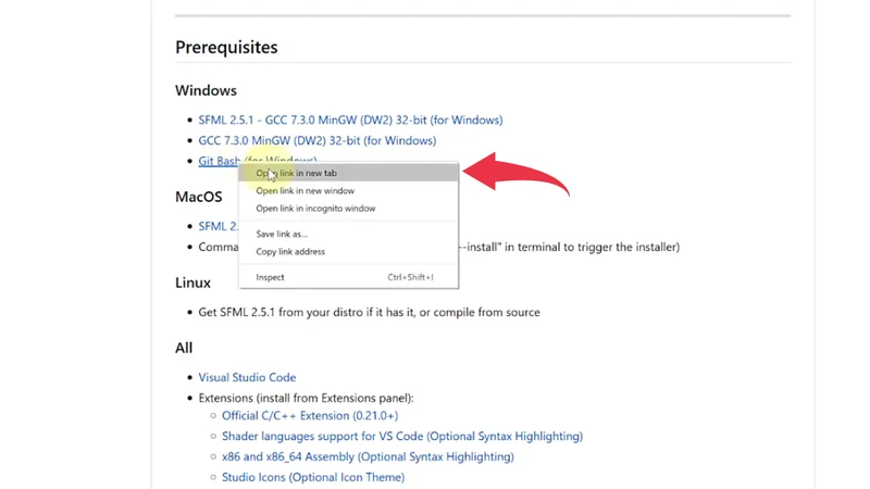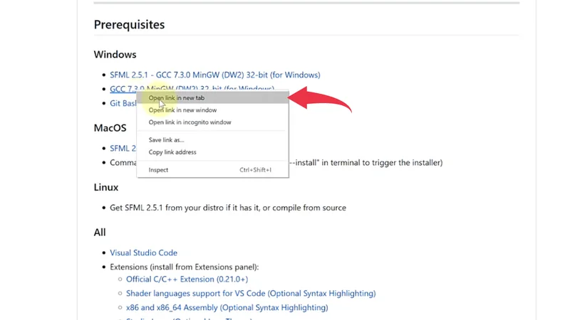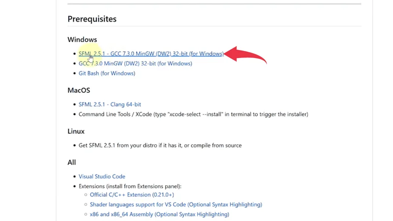 1) After that scroll down to the prerequisites section and under the windows, section click on the first link named SFML 2.5.1 - GCC 7.3.0 MinGW (DW2) 32-bit (for Windows) and SFML will start downloading for your windows machine.