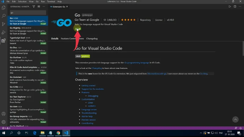 1) Open visual studio code, click on the extensions button, in the search bar type “GO” and install the first option from Team Google by clicking on the small green install button.